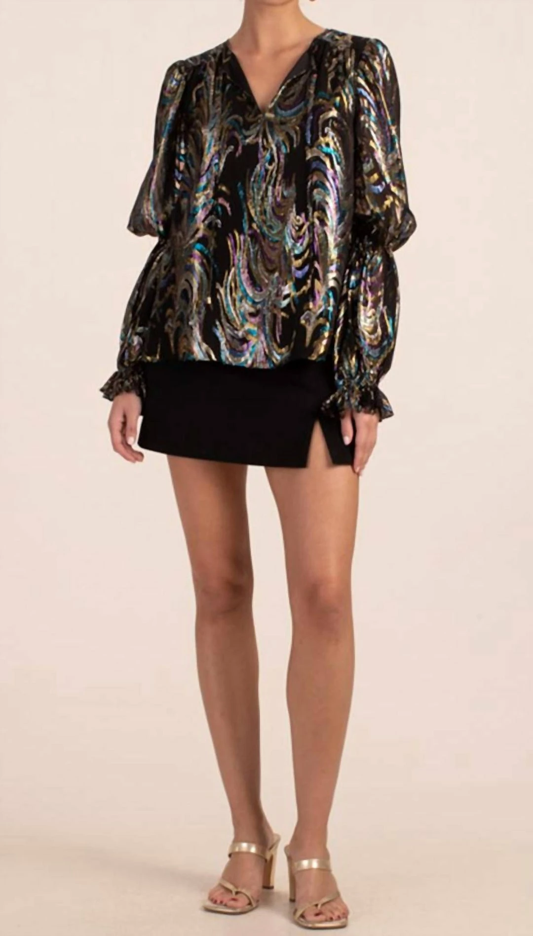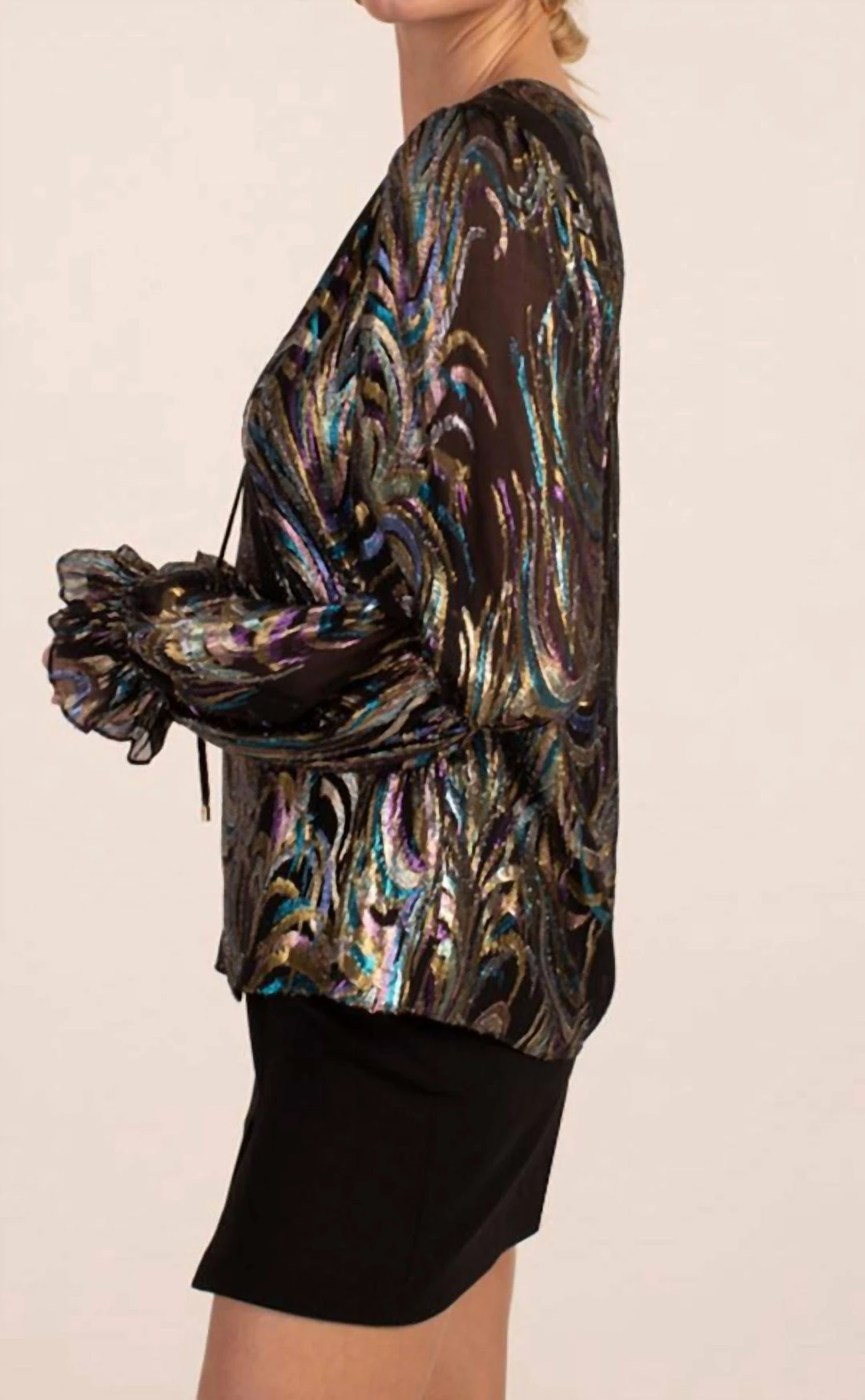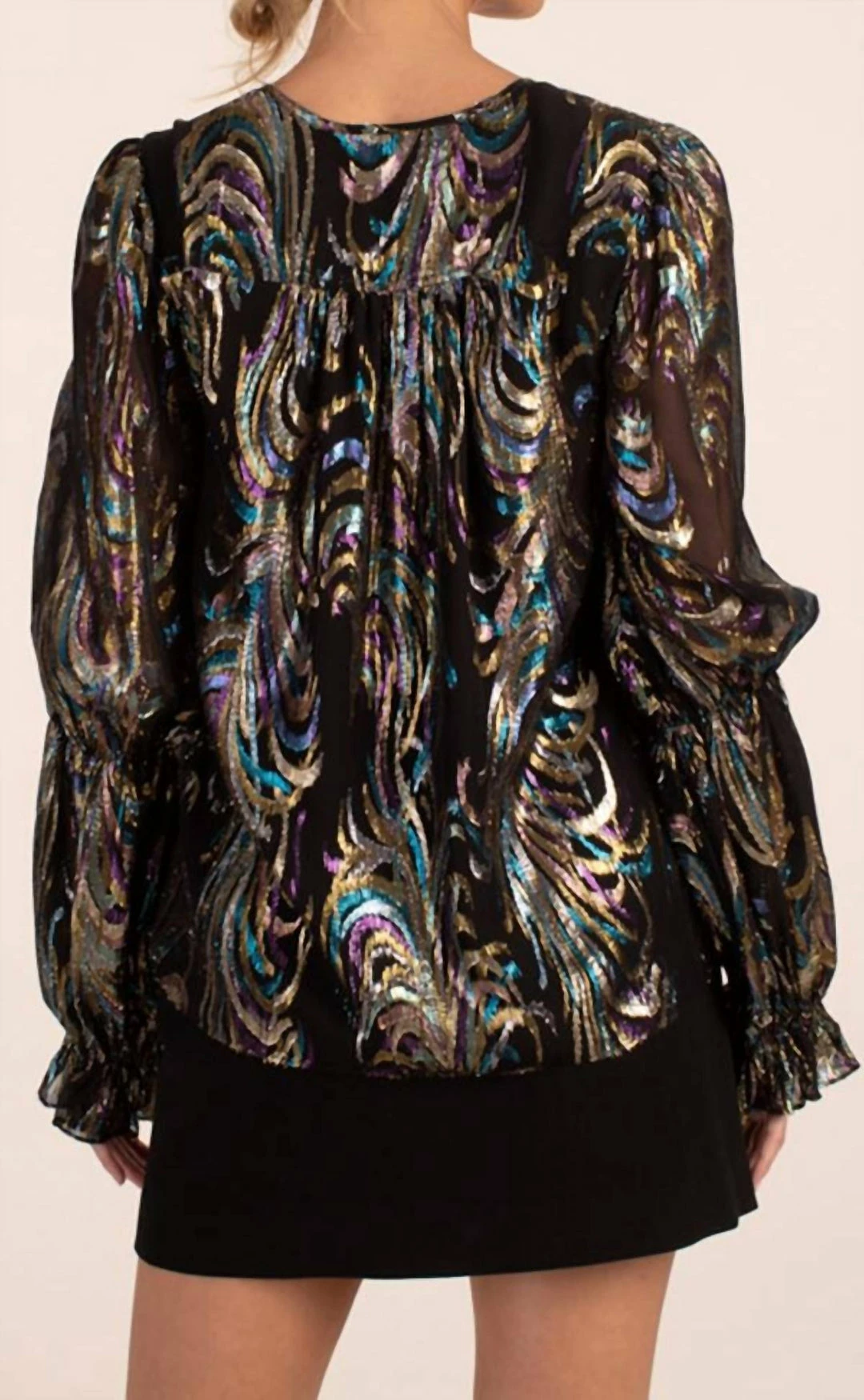 DetailsV-necklineLong, tiered balloon sleeves with ruffle cuffsRelaxed fitRuns true to sizeModel is 5’10”, wearing size SFABRIC – Phoenix Feather Clip GeorgetteContrast – Polyester Crepe de Chine – 100% Polyester; ImportedDry clean onlyImported