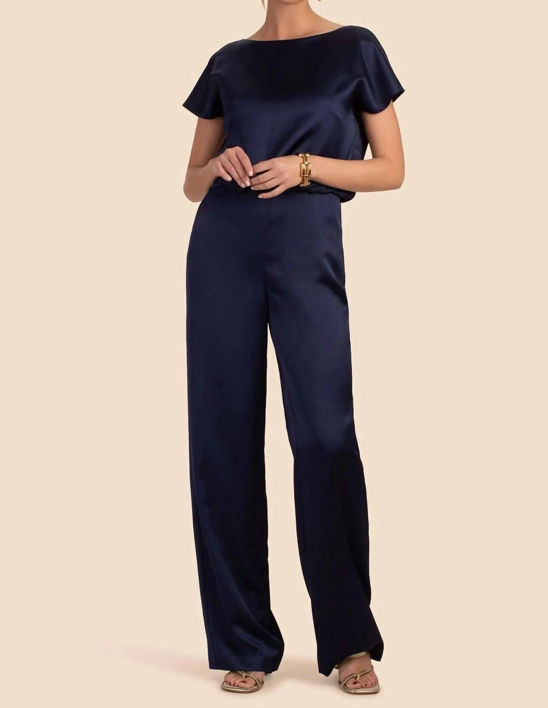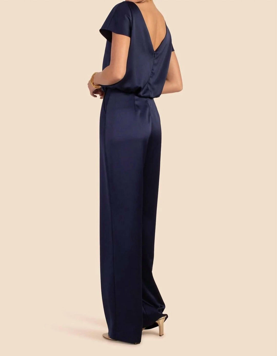 Sleek Silverlake satin instantly elevates this effortlessly glamorous jumpsuit with short dolman sleeves, boatneck, and blouson waist.BoatneckBlouson waistShort dolman sleevesSide slash pocketsFull-length pantV backBack zipperInseam – 32″Runs true to sizeModel is 5’10”, wearing size 2Fabric – Silverlake Satin100% PolyesterHand wash cold or dry cleanImported