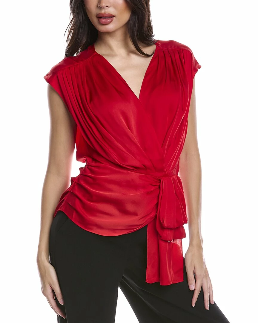 - Bijou Silk-Blend Top In Ribbon Red With Pleated Surplice Front, Cap Sleeves And Draped Waist Detail