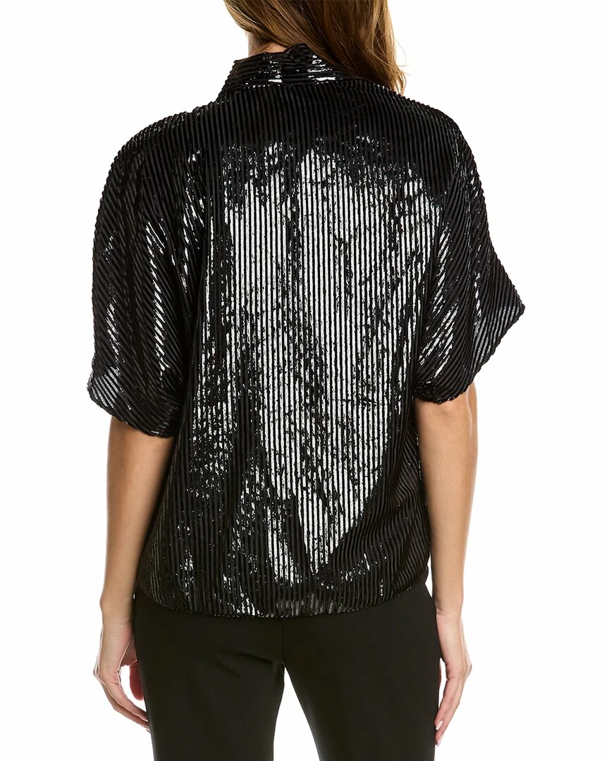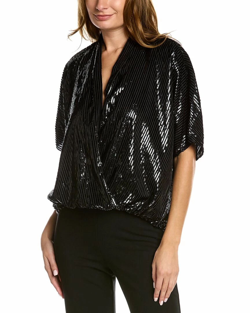 - Concourse Top In Black With Tinsel Stripe Design, Surplice Front, Elbow-Length Dolman Sleeves, And Gathered Front Hem