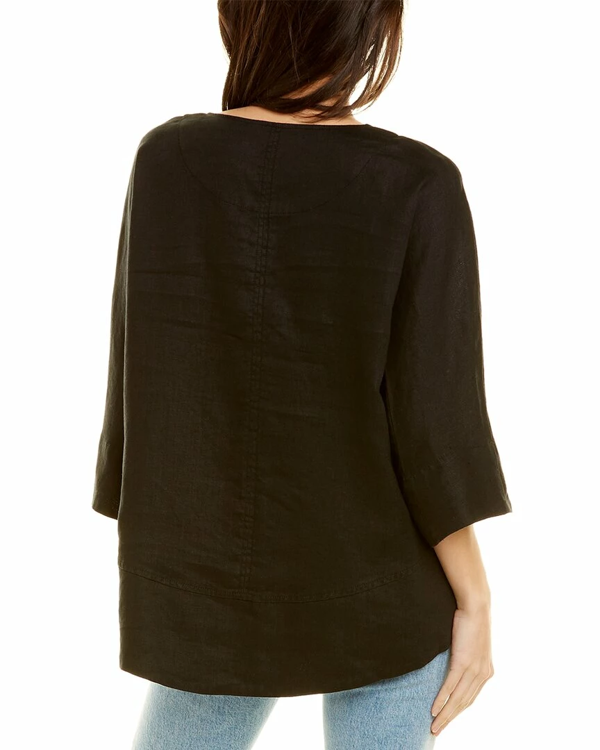 - Ease Linen Top In Black With Split Neck, 3/4-Length Sleeves, And High-Low Hem
