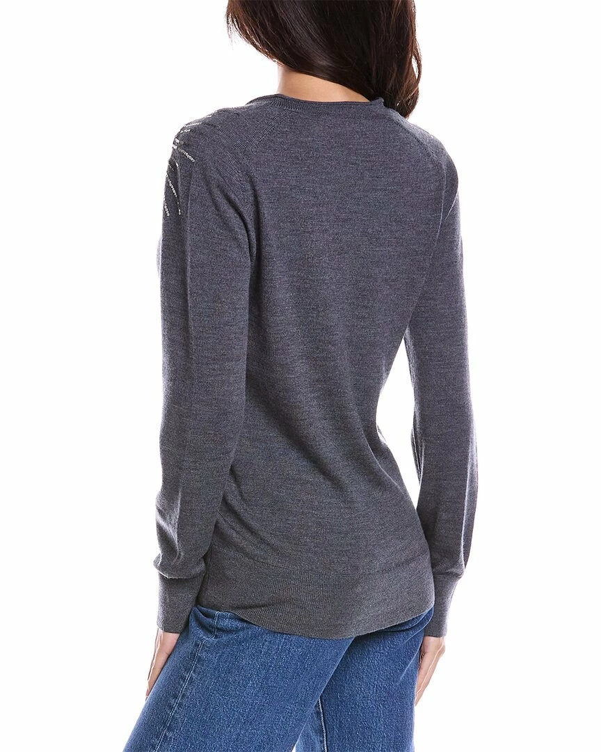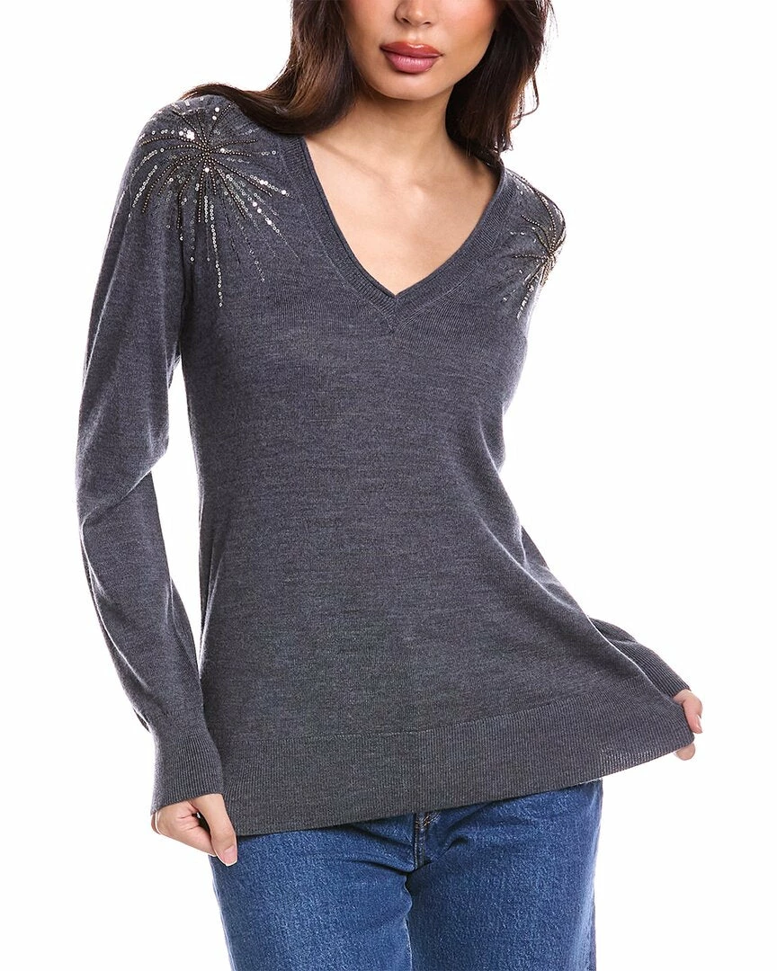- Evangeline Wool-Blend Sweater In Heather Grey/Gold With V-Neck, Bead And Sequin Embellishments And Ribbed Trim