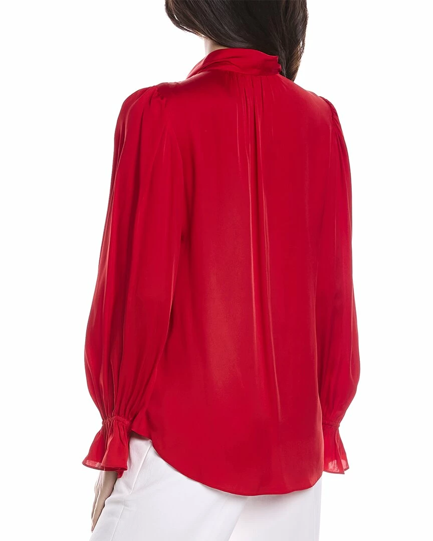 - Hemmingway Silk-Blend Top In Ribbon Red With Self-Tie Neck Sash, Shirring Details And Elasticized Flare Cuffs