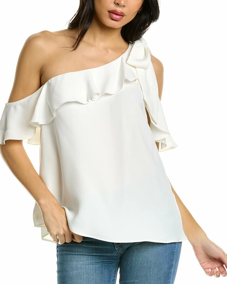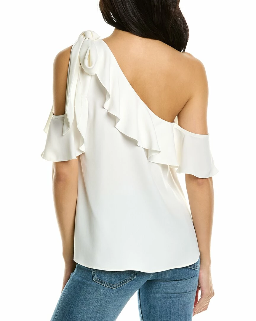 - Hot Springs Top In White Wash With One-Shoulder Design, Bow Shoulder, And Ruffle Trim