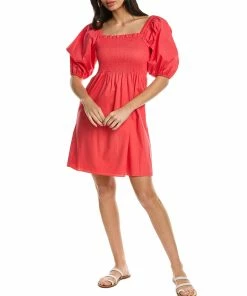 - Mesquite Mini Dress In Calle Coral With Smocked Bodice And Elbow-Length Balloon Sleeves