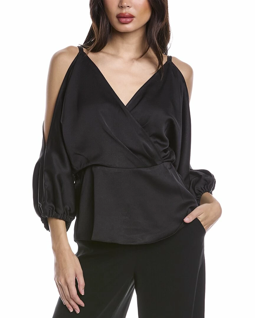 - Mixology Top In Black With Surplice Neckline, Cold-Shoulder Sleeves With Elasticized Cuffs And Peplum Hem