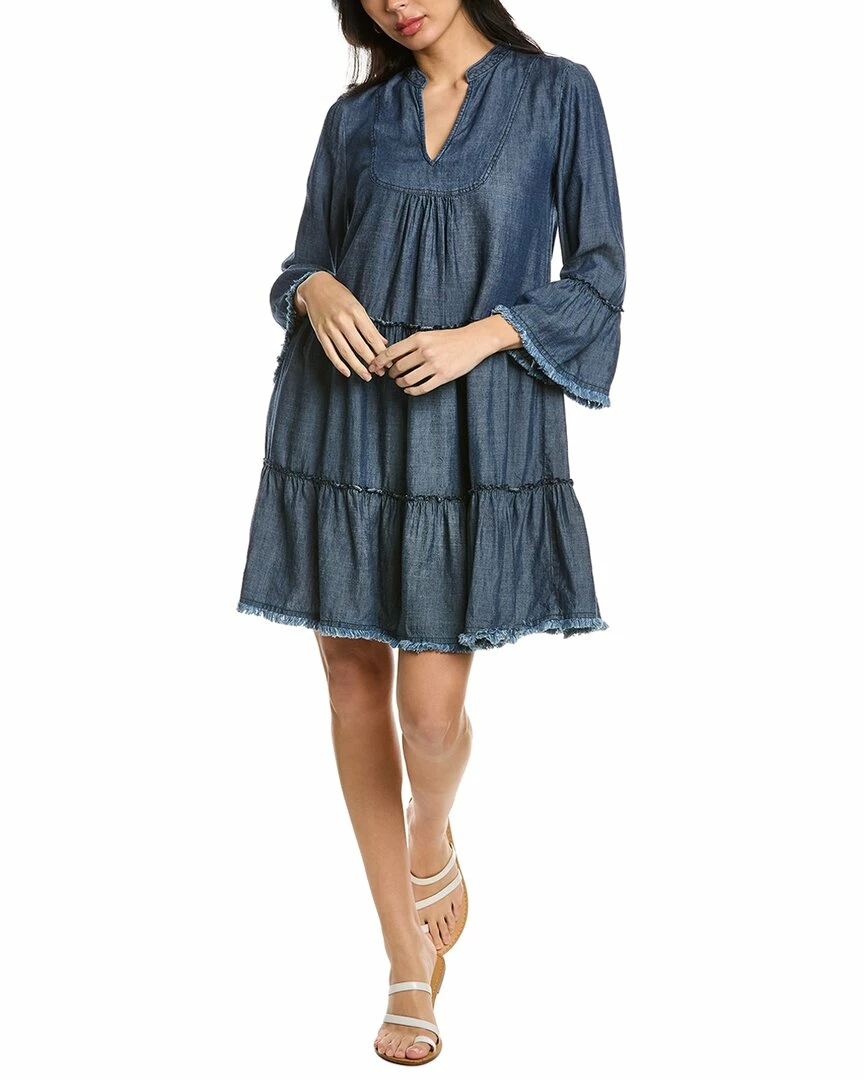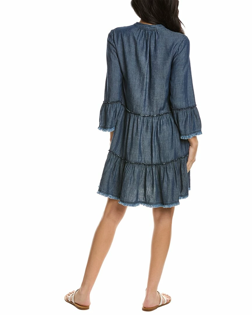 - Movie Colony Linen-Blend Dress In Indigo With 3/4-Length Bell-Sleeves, Tiered Shirring, And Fringe Trim