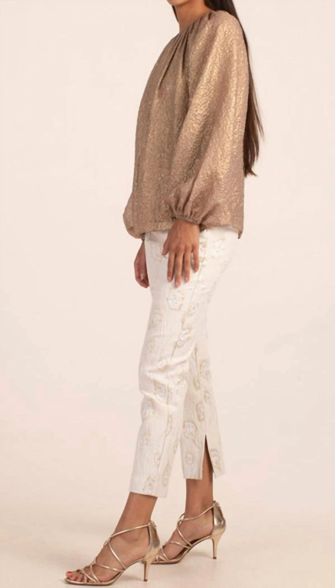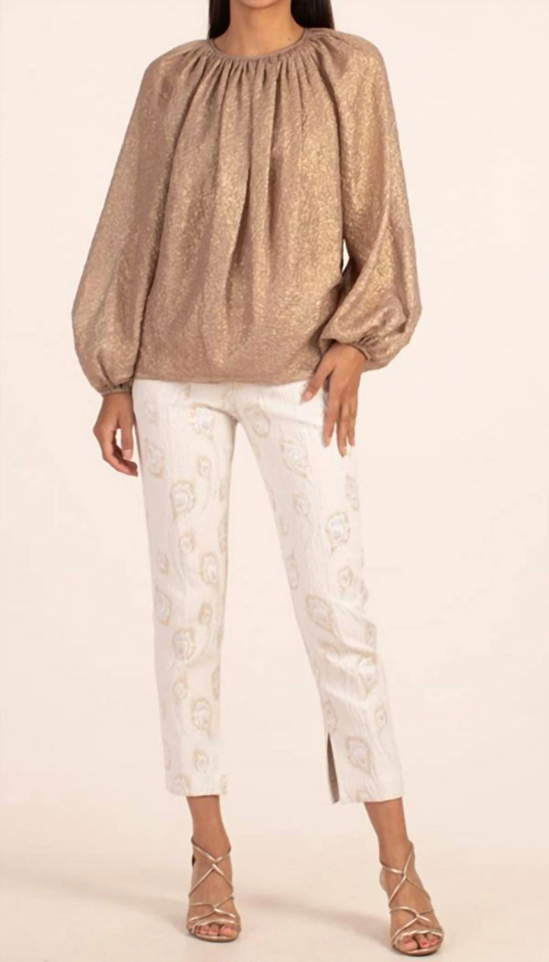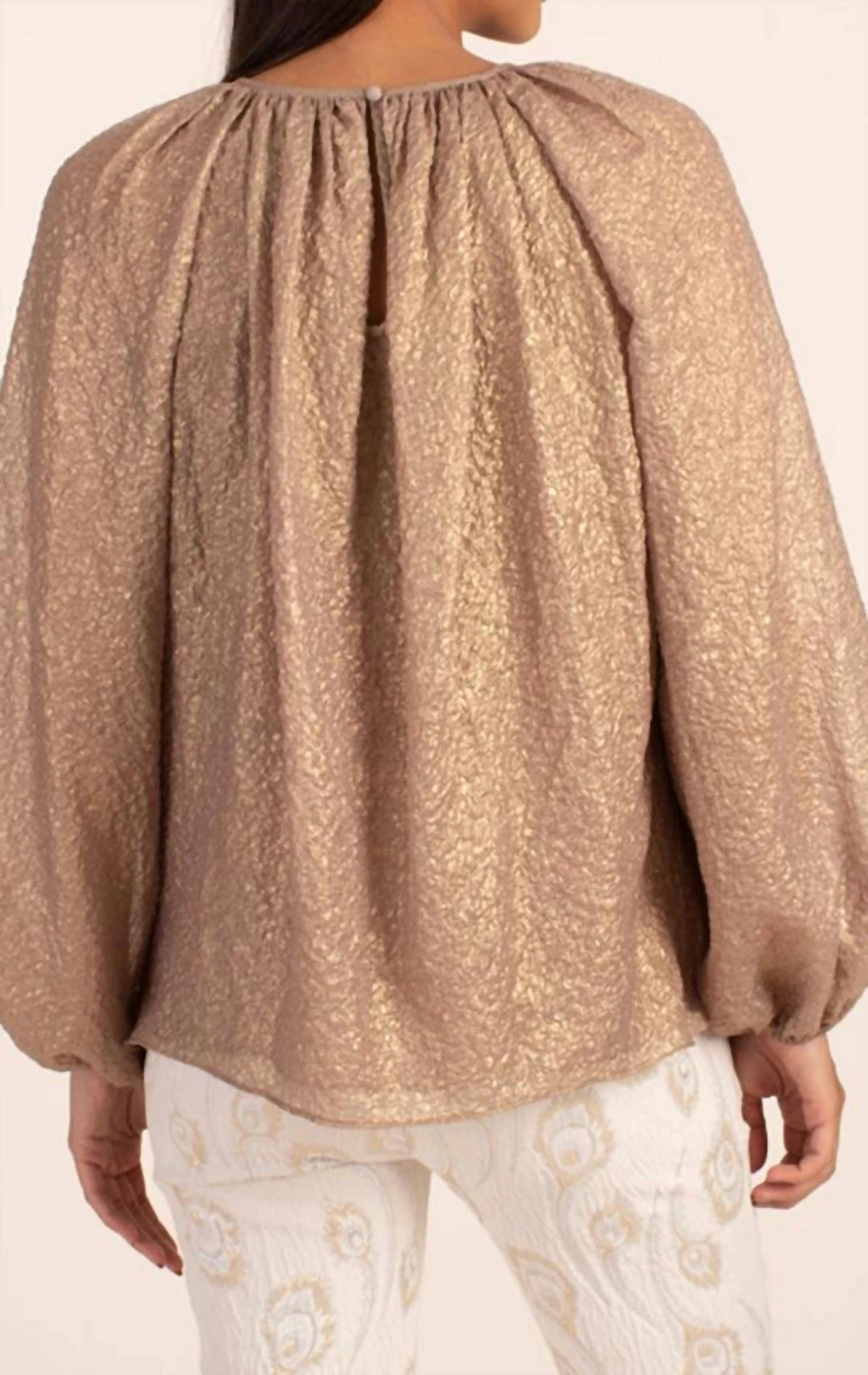 Balloon sleeves end in a cinched cuff + button closure at the back of the neck.οΏ½οΏ½linedflawless beige and goldhand wash cold, lay flat to dry. Do not bleach. Do not dry clean.