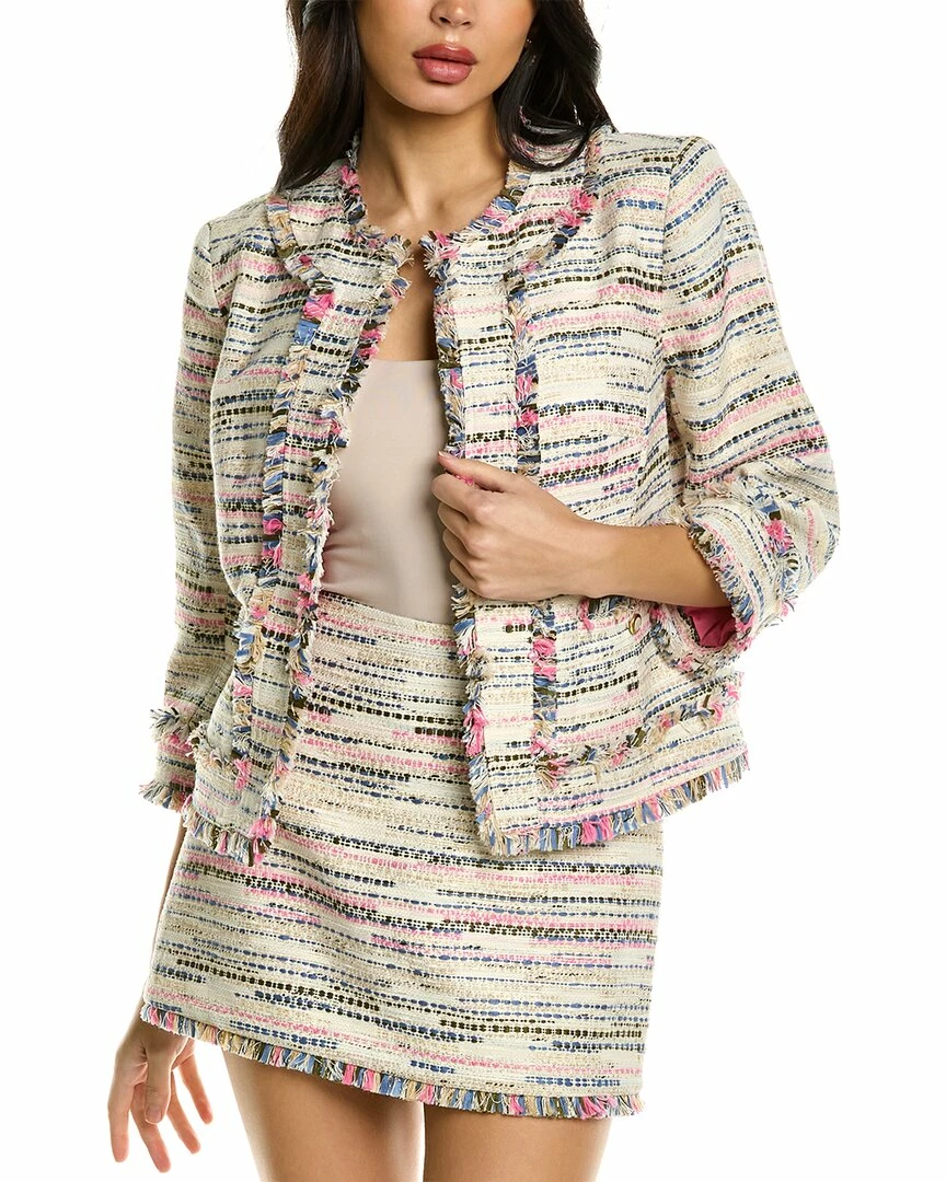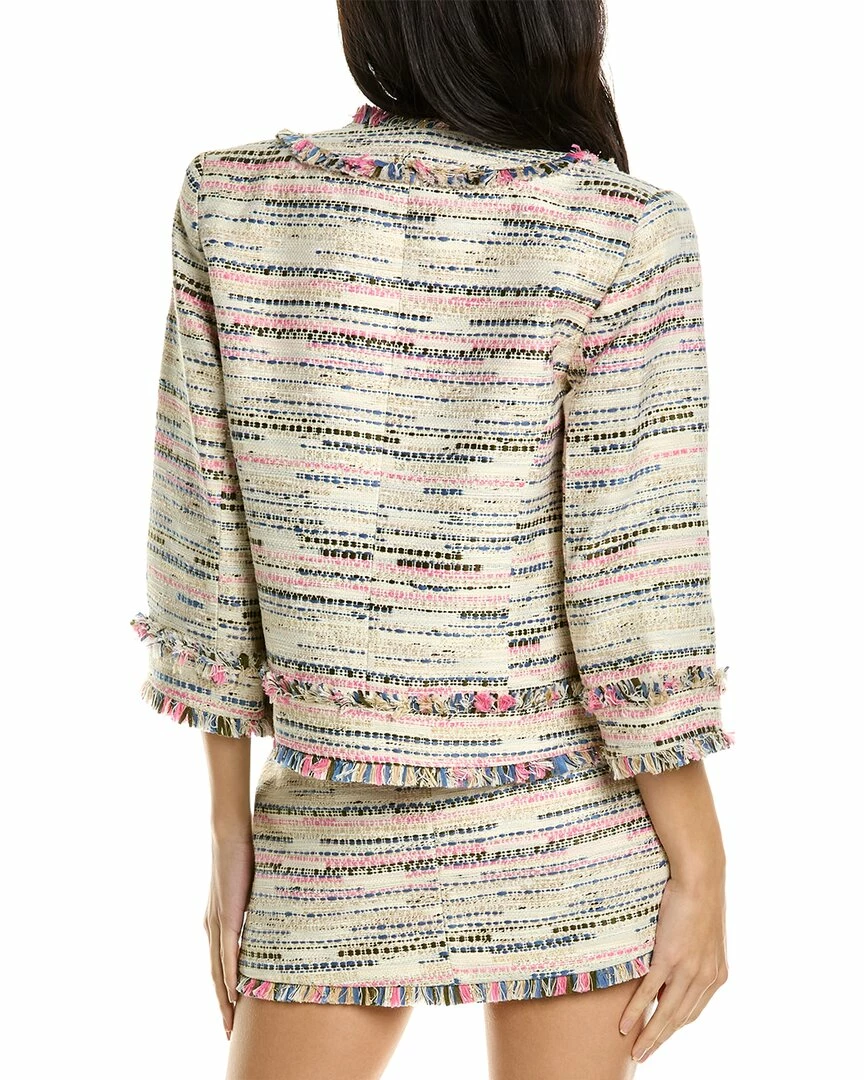 - Pepper Tree Jacket In Multicolor With Tweed Design, Fringe Trim, Two Front Pockets, And 3/4-Length Sleeves