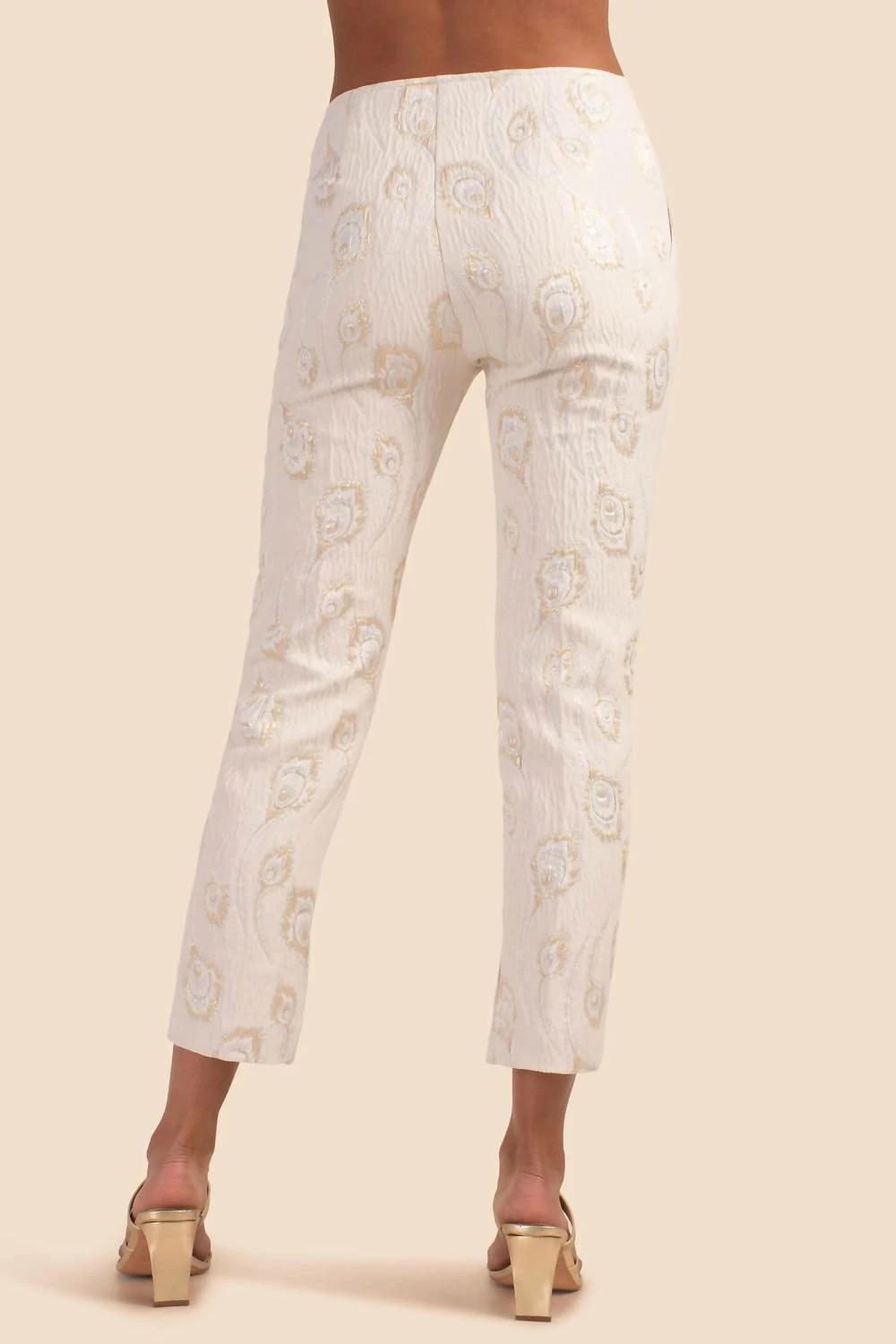 Luxe Pavo Jacquard adds elevated style to these slim, cropped pants, and metallic threads add brilliant dimension. Pair these flattering pants with a dressy top and heels for a sophisticated soirรยฉe or a night out.Flat frontSide slash pocketsSlash at inside hemSide zipperCropped lengthFitted through hips and thighsSlight kick flare hemInseam – 27″Runs true to sizeModel is 5’10”, wearing size 2FABRIC – Pavo Jacquard64% Polyester, 18% Metallic Fibers, 18% Organic CottonDry clean onlyFabric from France