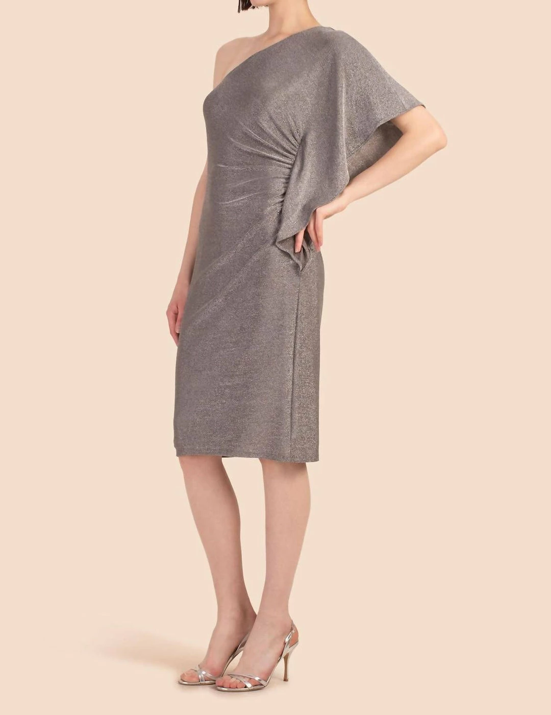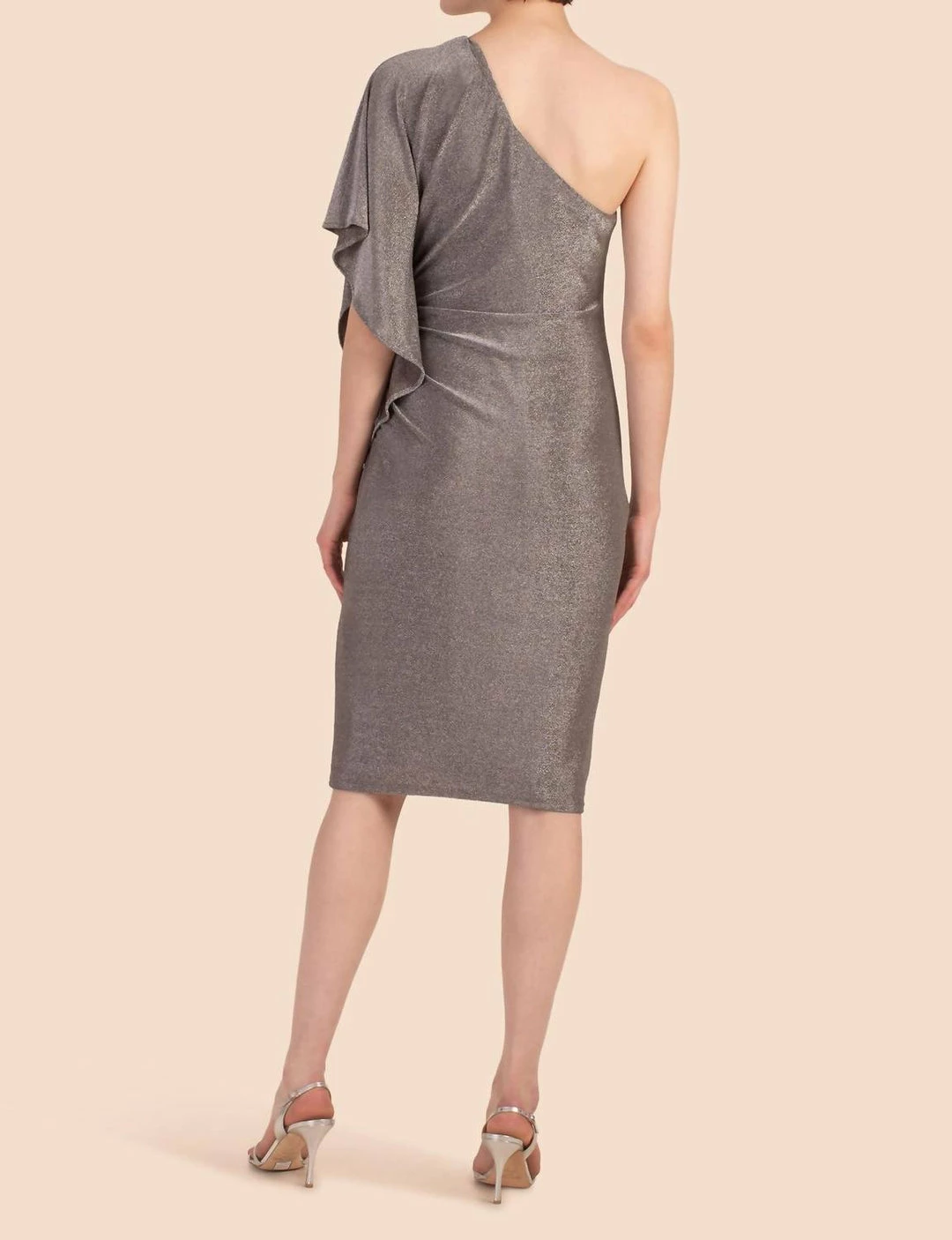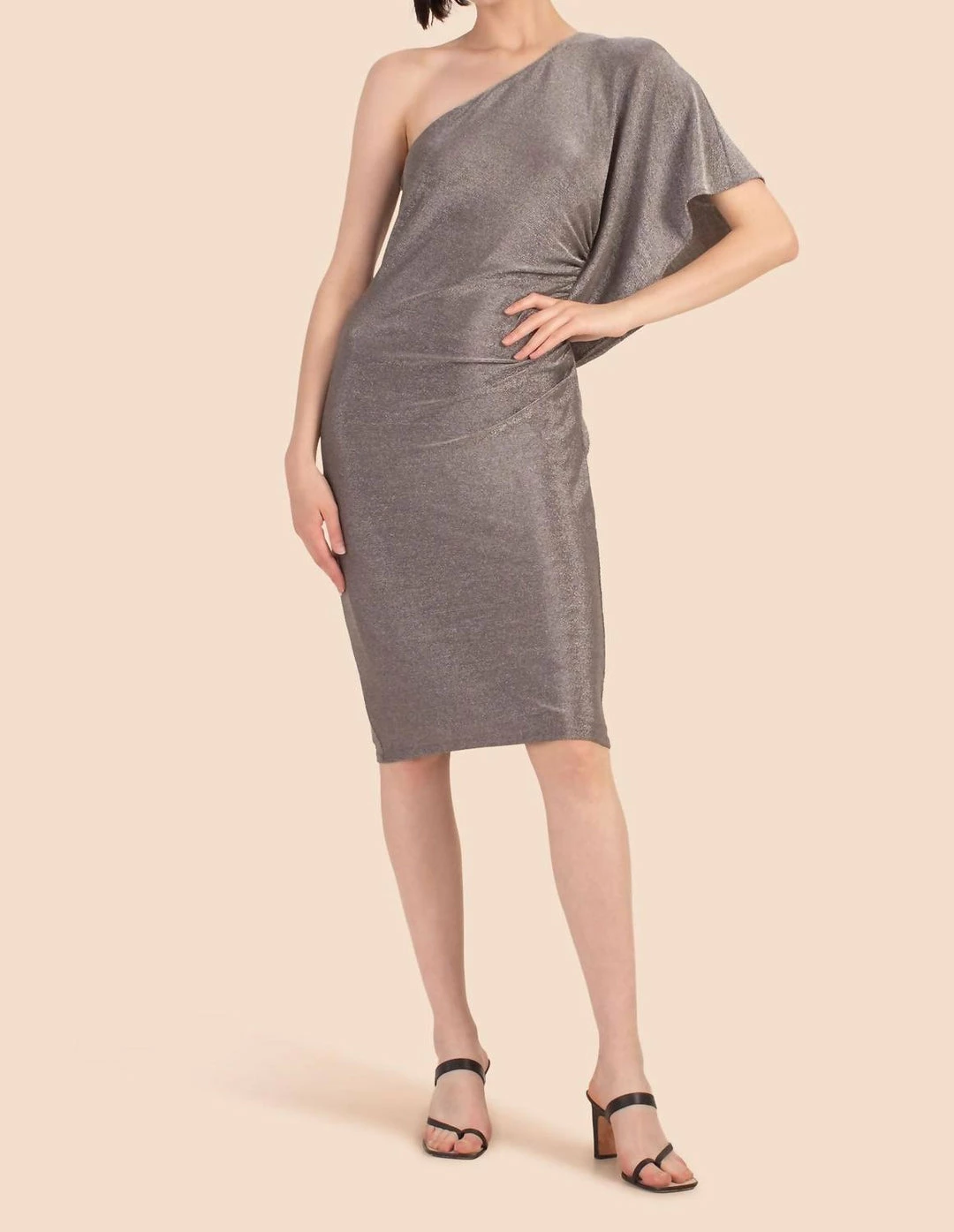 Sleek and chic, this one-shoulder dress is striking in metallic, Mercury silver with side ruching details. An asymmetrical neckline and slinky jersey fabrication make this stretch, bodycon dress effortlessly chic, travel-friendly, and ready for a night out.Asymmetrical, one-shoulder necklineOne-side ruching detail with ruffleFitted, bodycon silhouettePull-on stylePackable and travel-friendlyKnee lengthRuns true to sizeModel is 5’10”, wearing size SFABRIC – Twilight Jersey74% Polyamide, 23% Metallic, 3% ElastaneDry clean onlyImported
