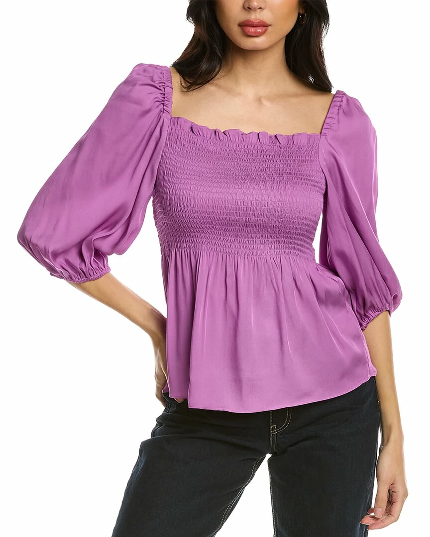 - Tacoma Silk-Blend Top In Lupine With Smocked Bodice And Elbow-Length Balloon Sleeves