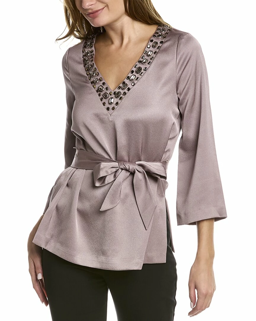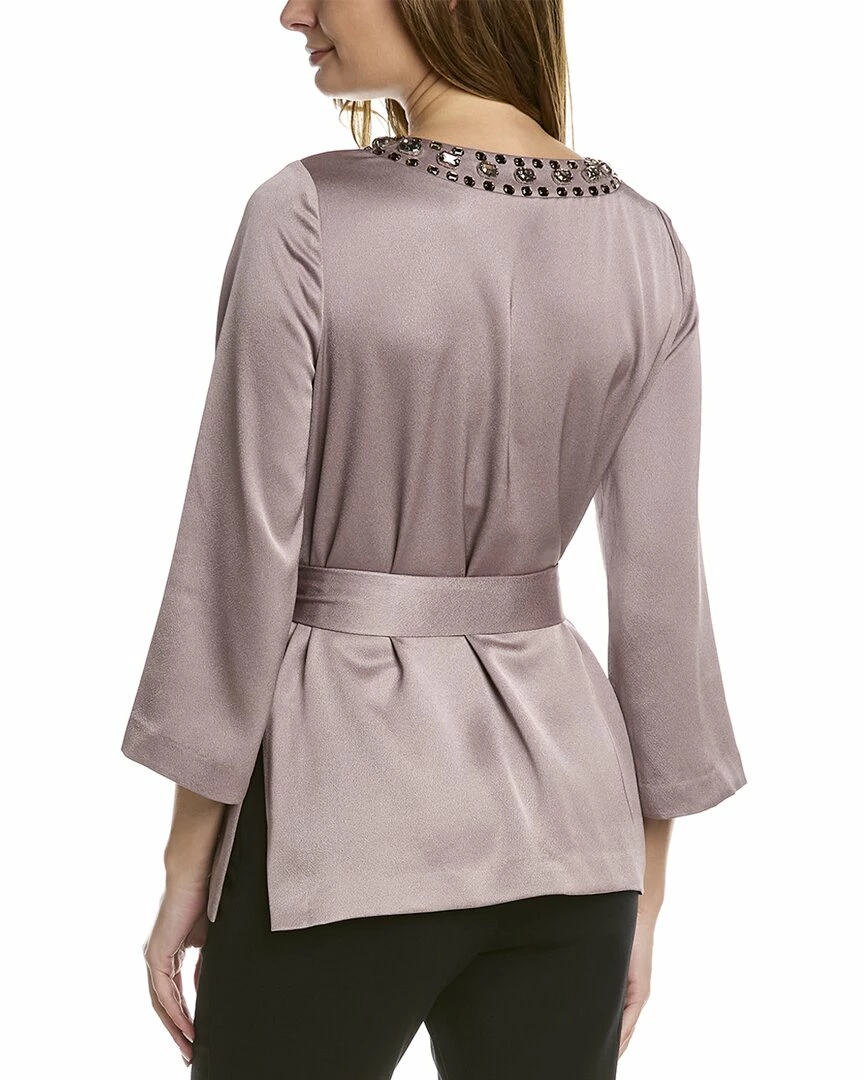 - Thrilled 3/4-Sleeve Tunic In Chanterelle With Matte Satin Design, Bead Embellished Neckline, Tie Sash At Waist, And Kimono Sleeves